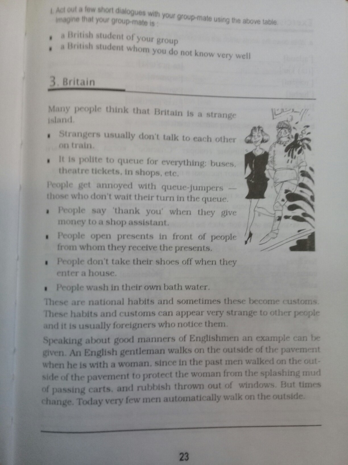 Говоря о хороших манерах Англичан можно привести пример. Английский джентльмен идет по внешней стороне тротуара, когда он с женщиной, поскольку в прошлом мужчины шли с внешней стороны тротуара, чтобы защитить женщину от брызг грязи проезжающих повозок и выбрасываемого мусора из окон. Но времена меняются. Сегодня очень мало мужчин автоматически идут по внешней стороне.
