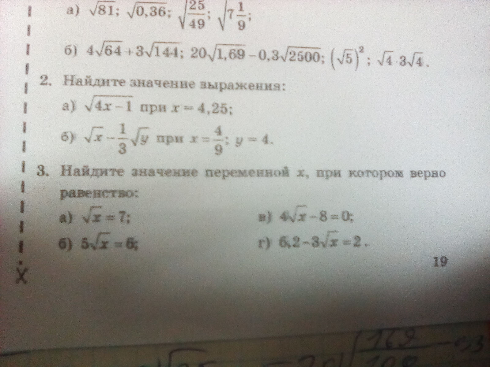 2). а). (4*4,25-1)^1/2=(17-1)^1/2=16^1/2=4; б).(4/9)^1/2-1/3*(4)^1/2=2/3-1/3*2=2/3-2/3=0. 3). a). x=49; б). x^1/2=6/5; x=(6/5)^2=36/25; в). 4x^1/2=8; x^1/2=2; x=4; г). 6,2-3x^1/2=2; -3x^1/2= -4,2; x^1/2=1,2; x=1,2^2=1,44.