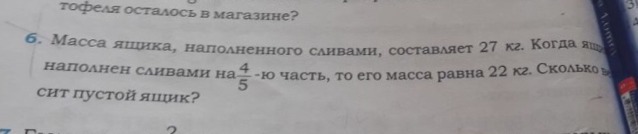 Пустой ящик весит 2кг т.к. 3/5 весит 17кг, 2/5 весит 12 кг, 1/5 весит 7кг, следовательно пустой ящик весит 2кг
