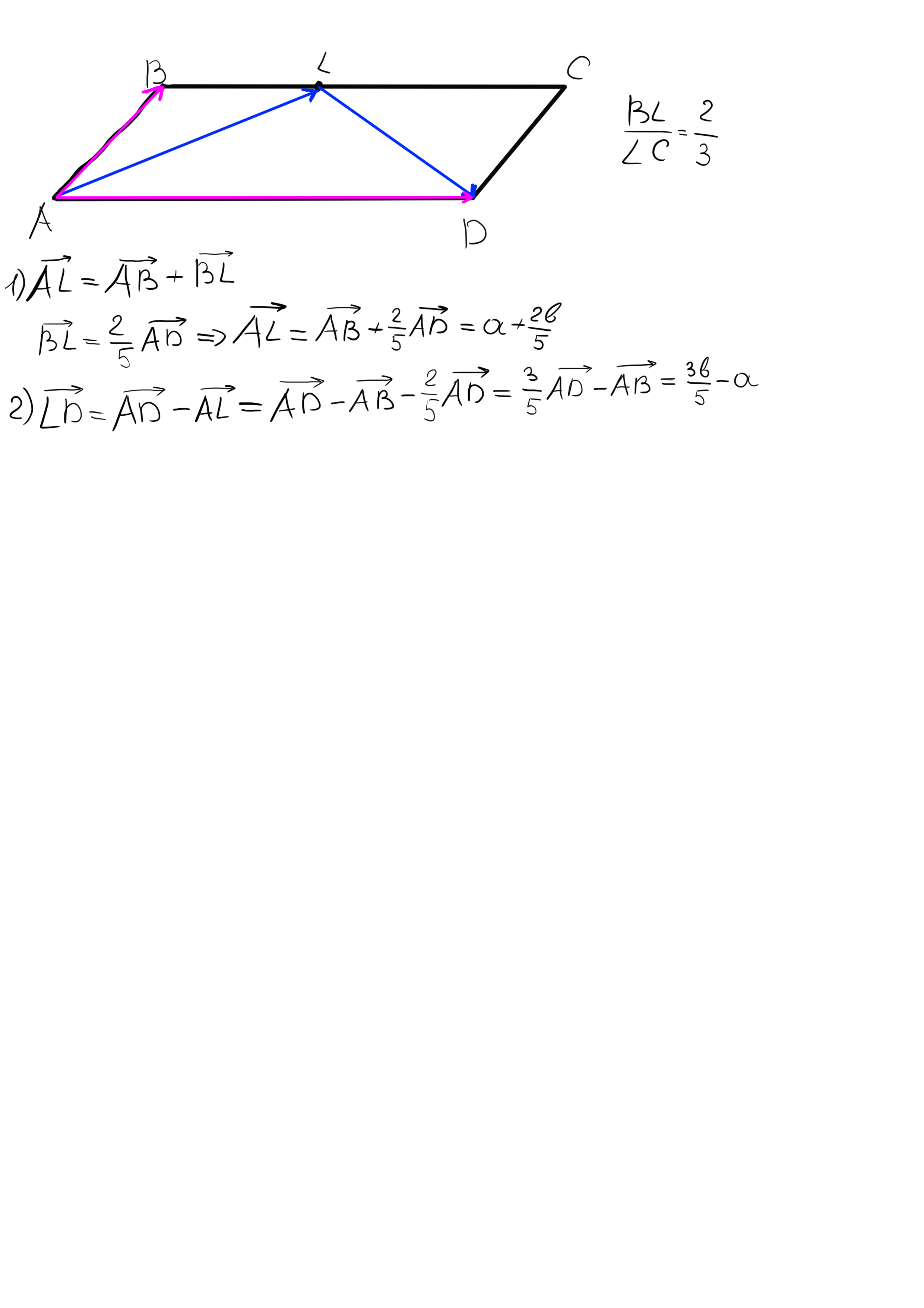 В параллелограмме ABCD точка L делит сторону BC на части BL:LC=2:3 выразите векторы AL и LD через векторы AB=a и AD=b