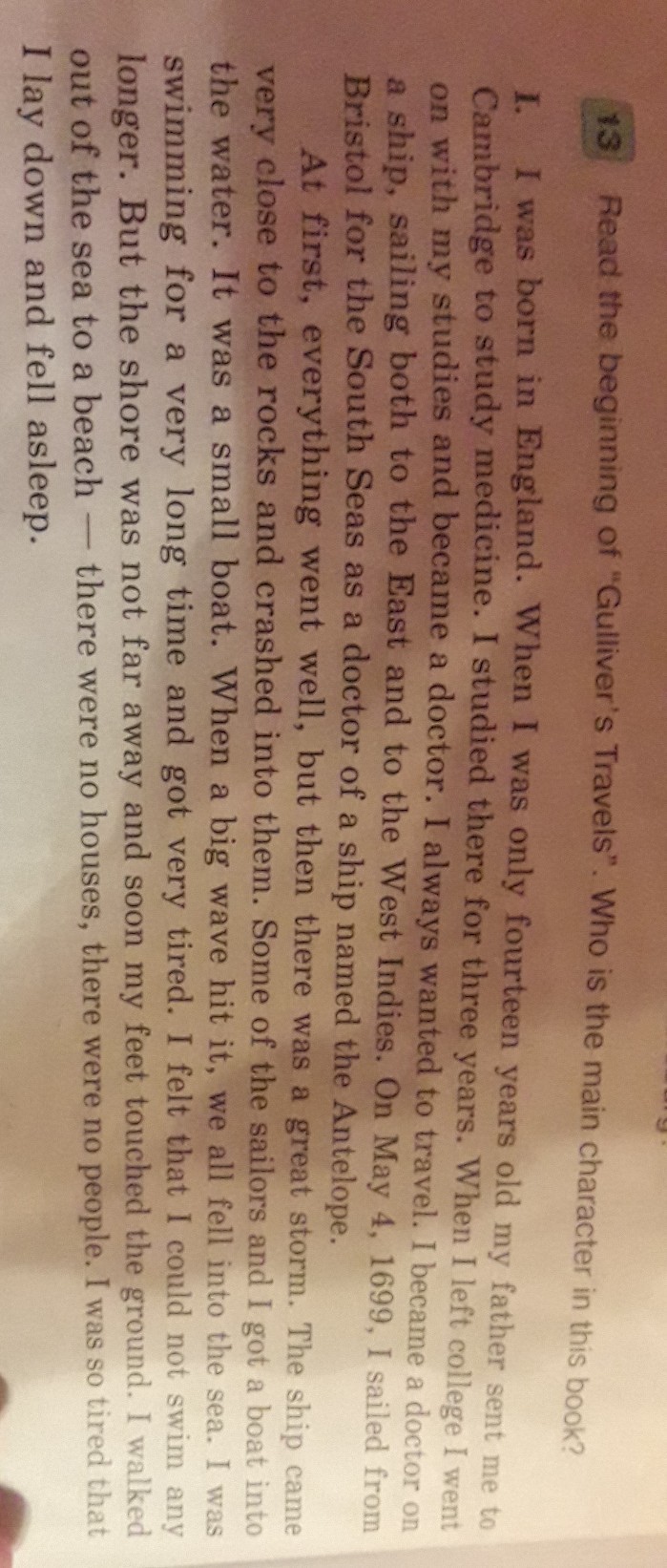 Я родился в Англии.Когда мне было всего лишь 14 лет мой отец отправил меня в Кембридж на учебу в Медицинский.Я учился там 3 года.Когда я окончил колледж я стал доктором.Я всегда хотел путешествовать.Я стал доктором на корабле плавая по восточной и западной Индии.4 мая 1969 года я уехал из Бристоля на южные моря в качестве доктора на корабле Антилопа.В первое время,все шло хорошо но потом там случился великий шторм.Корабль подошел близко к скалам и случилось кораблекрушение.Я и несколько моряков бросились на воду в лодки.Это была маленькая лодка.Когда большая волна ударила ее мы выпали из нее в море.Я слишком долго плавал и очень устал.Я почувствовал что я не могу плыть дальше.Но берег находился недалеко и скоро мои пятки коснулись земли.Я выбрался из моря на пляж там не было ни домов ни людей.Я был таким уставшим что лег и заснул.