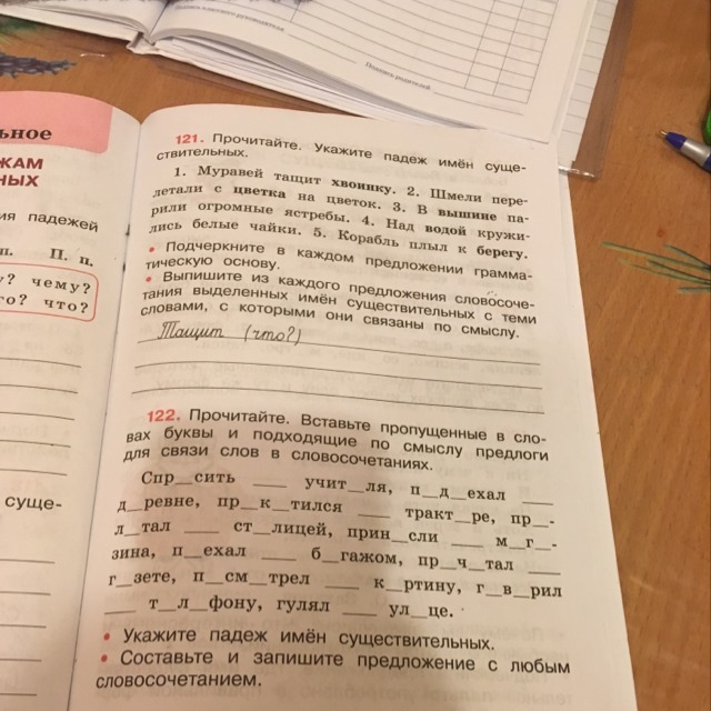 Тащит ( Что?) хвоинку в.п., перелетали с ( чего?) цветка Р.п., над (чем?) водой Т.п., В (чём?) вышине П.п, к (чему?) берегу П.п