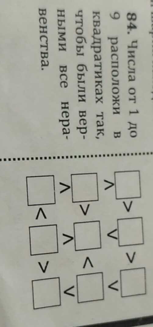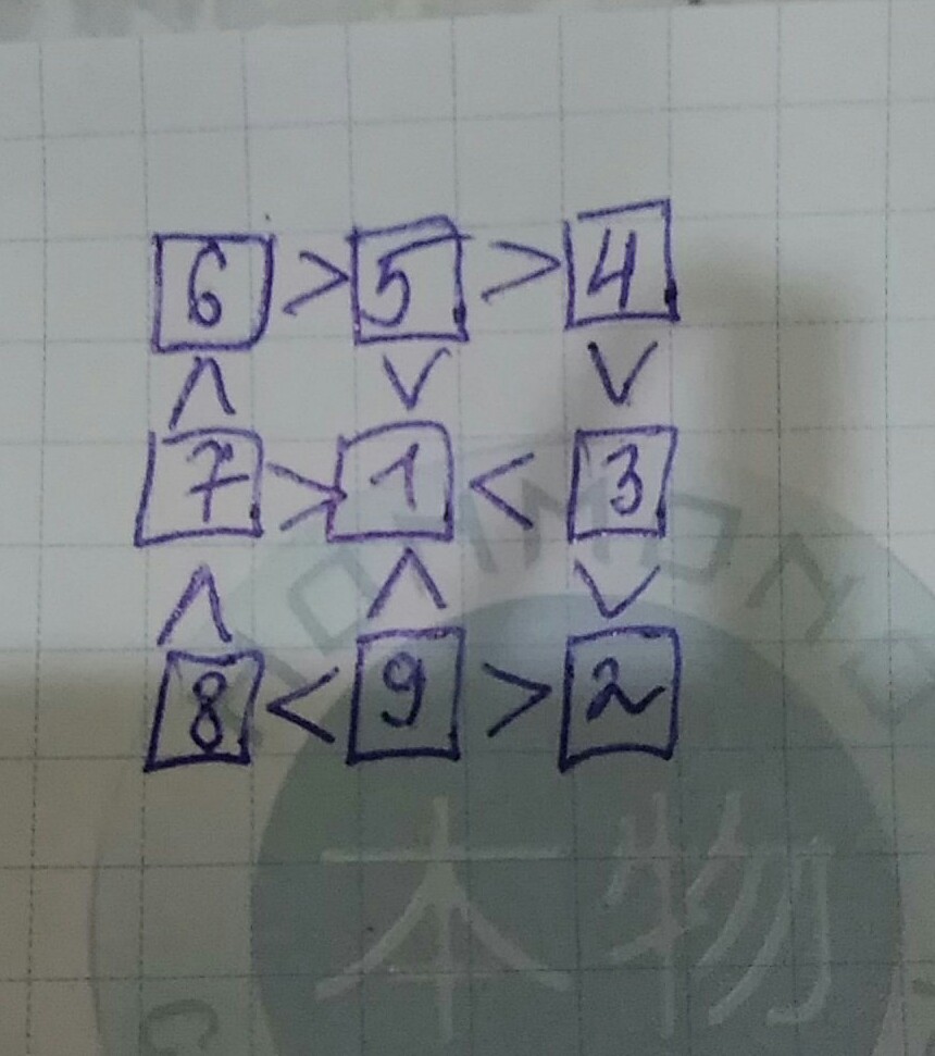 сначала по знакам находишь число которое больше всех и которое меньше всех, а потом по часовой стрелке заполняешь остальное. (ответ на фото)