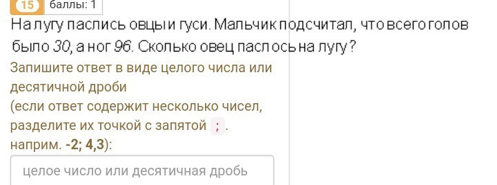 Пусть овец паслось-х,тогда гусей-у,у овцы 4 ноги-4х,у гуся-2 ноги-2у Составим систему: х+у=30 и 4х+2у=96 х=30-у и 4(30-у)+2у=96 120-4у+2у=96 -2у=-24 у=12-гусей, х=30-12=18-овец--(у тебя в задаче в условии были перепутаны ноги и головы,голов не может быть больше,чем ног) ответ:18 овец.