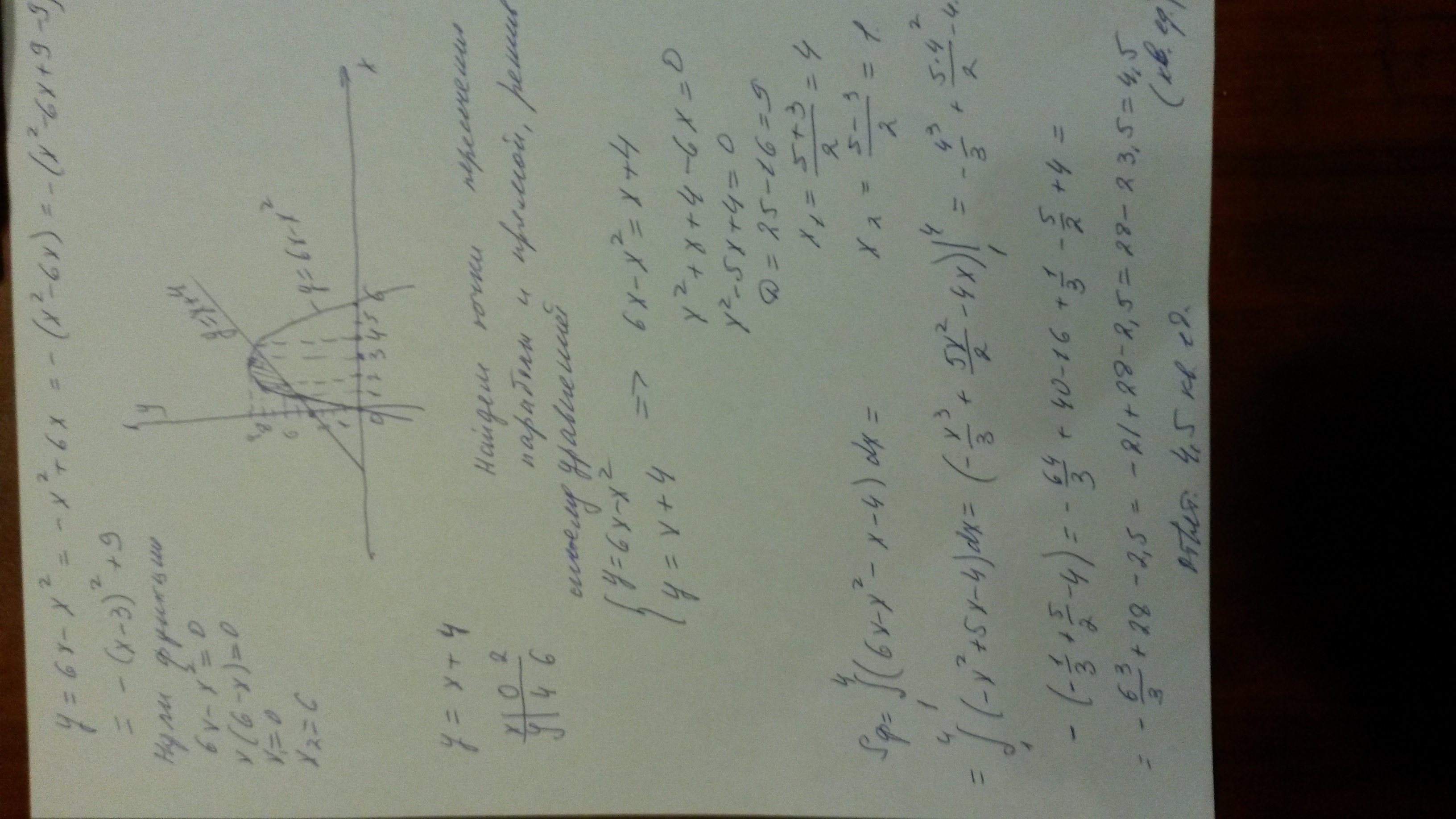 Вычислите площадь фигуры, ограниченной параболой y=6x-x^2 и прямой y=x+4. Выполните чертёж. Объясните ход решения, если можно!!