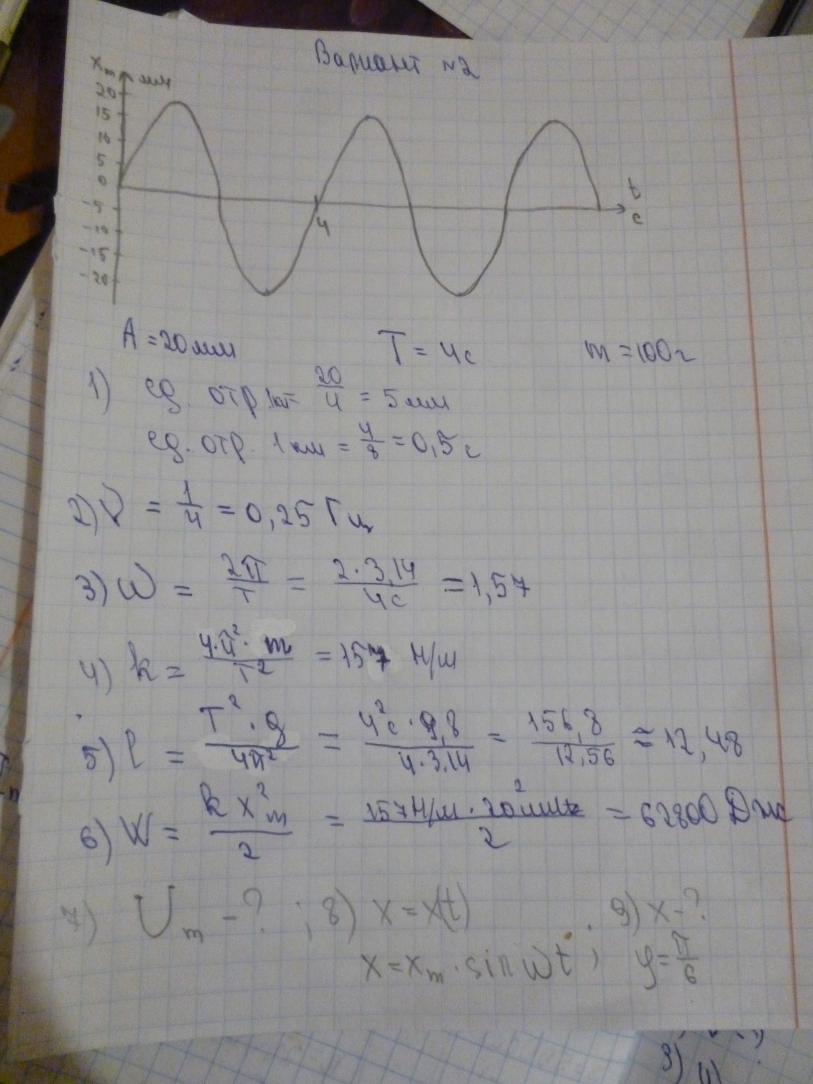 7) vm=ω*xm=1.57*0.02=0.0314 м/с