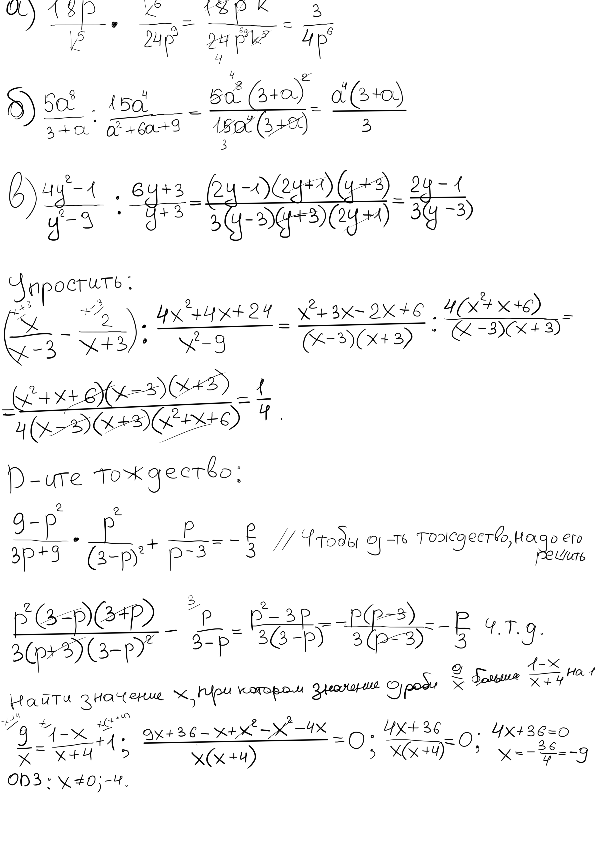 Помогите пожалуйста решить:Выполни действия а) 18р^3/k^5*k^6/24p^9 ; б) 5a^8/3+a:15a^4/a^2+6a+9 ; в) 4y^2-1/y^2-9:6y+3/y+3 Упрости выражение (х/ х-3-2/х+3):4х^2+4x+24/x^2-9 Докажите тождество 9-p^2/3p+9*p^2/(3-p)^2+p/p-3=-p/3 Найдите значение Х, при котором значение дроби 9/х больше 1-х /х+4 на 1