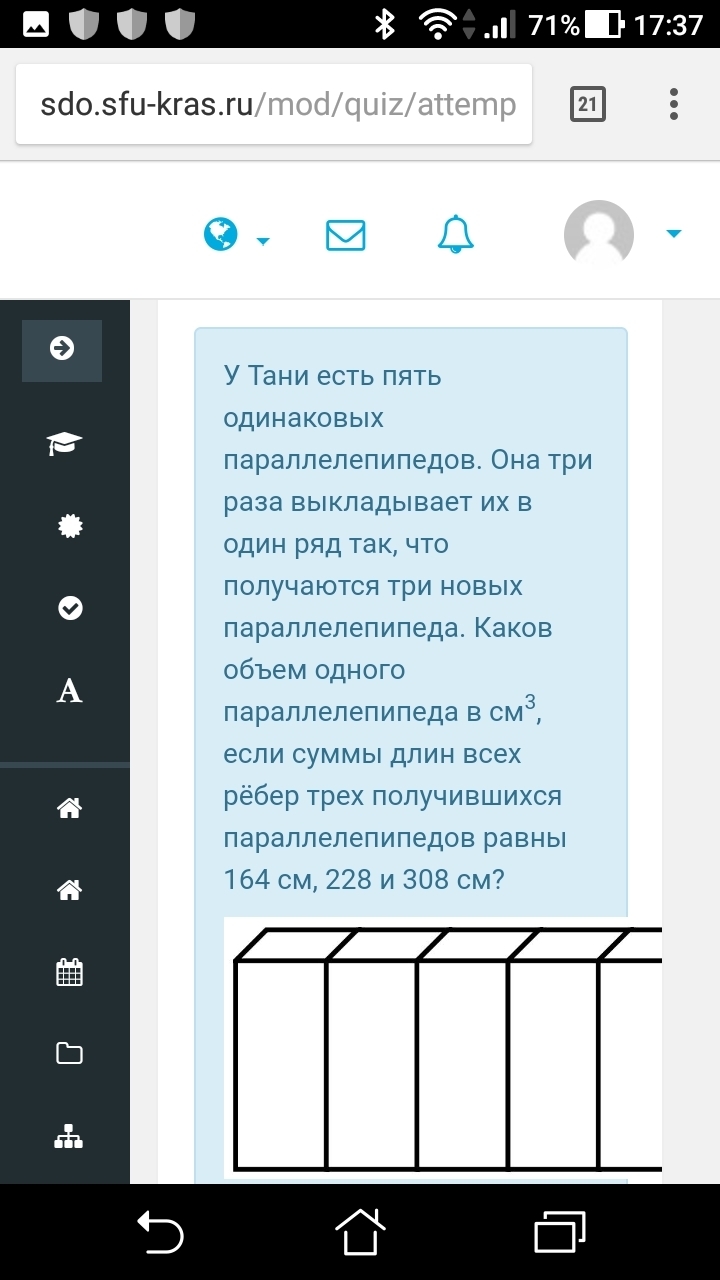 У Тани есть пять одинаковых параллелепипедов. Она три раза выкладывает их в один ряд так, что получаются три новых параллелепипеда. Каков объем одного параллелепипеда в см3, если суммы длин всех рёбер трех получившихся параллелепипедов равны 164 см, 228 и 308 см?