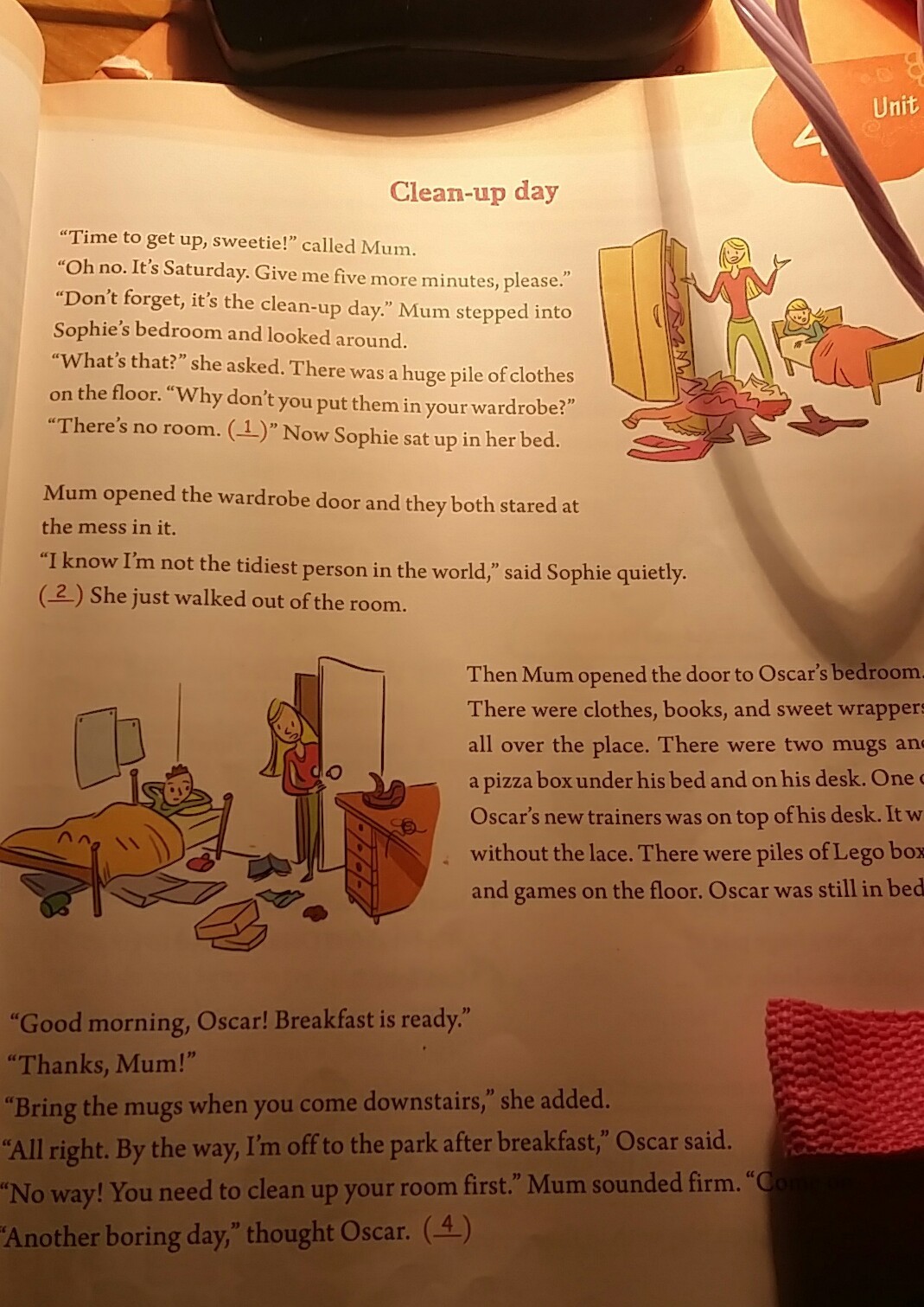 "О,нет. Сегодня Суббота. Дай мне ещё пять минут, пожалуйста." "Не забывай сегодня день уборки."Мама зашла в спальню Софьи и посмотрела вокруг. "Что это?" она спросила. Там была большая куча одежды на полу. "Почему ты не скаладываешь одежду на полки?" "Это же не комната " Сейчас Софья села на свою кровать.