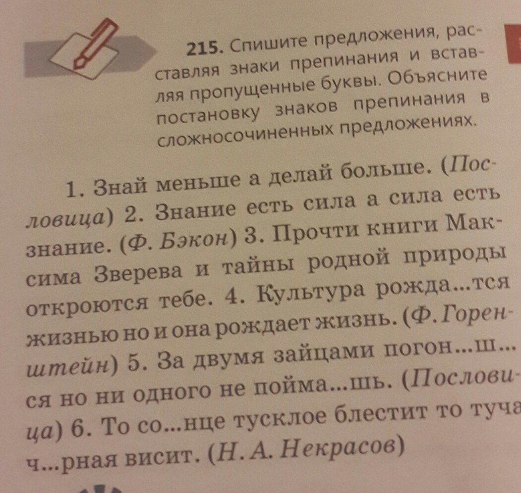 Знай меньше, а делай больше. Знание есть сила, а сила есть знание (две грамматические основы). Прочти книги Максима Зверева, и тайны родной природы откроются тебе (две грамматические основы). Культура рождается дизнью, но и она рождает дизнь (две грамматические основы, союз но). За двумя зайцами погонишься, но ни одного не поймаешь. То солнце тусклое блестит, то туча черная висит (две грамматические основы).