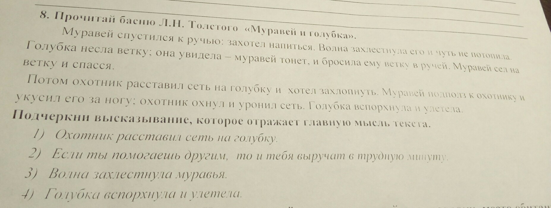 прочитай басню Л.Н. Толстого "Муравей и голубка". Подчеркни высказывание, которое отражает главную мысль текста