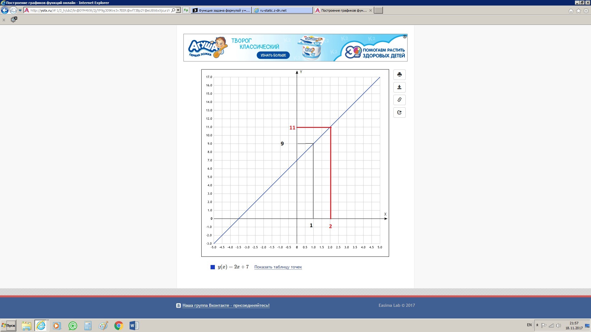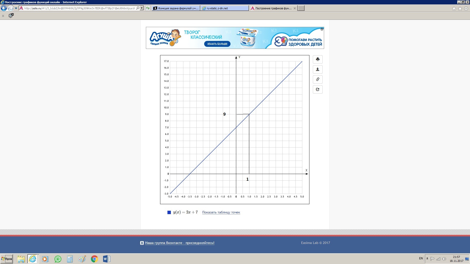 Функция задана формулой y= -2 + 7. Определить: 1) значение функции, если знание аргумента равна 6 2)значение аргумента, при котором значение функции равно -9 3) проходит ли график функции через точку А (-4; 15 )