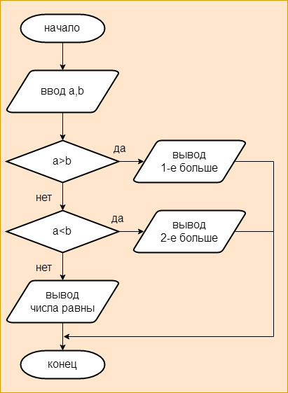 1.Составить блок-схему , которая сравнивает два числа, введенные с клавиатуры. Блок-схема должна указывать, какое число больше, или, если числа равны, вывести соответствующее сообщение.
