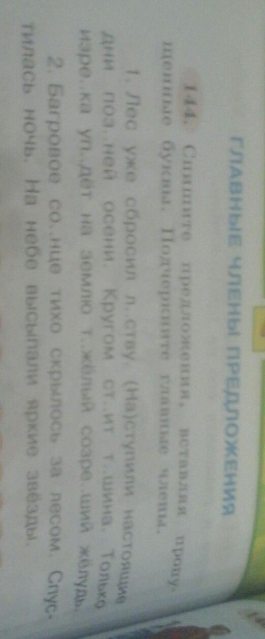 2. Багровое соЛнце тихо скрылось за лесом. Спустилась ночь. На небо высыпали яркие звёзды.