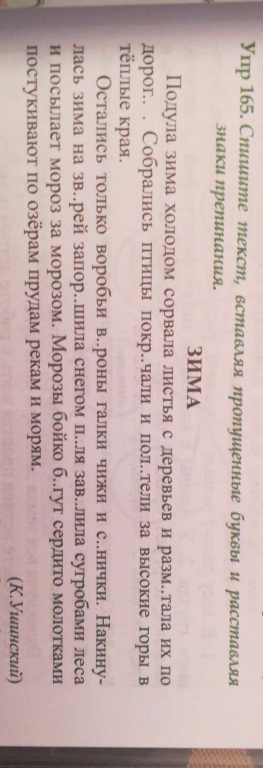 Остались только воробьи, вороны, галки, чижи и синички. Накинулась зима на зверей, запорошила снегом поля, завалила сугробами леса, и посылает мороз за морозом. Морозы бойко бегут, сердито молотками постукивают по озерам, прудам, рекам и морям.