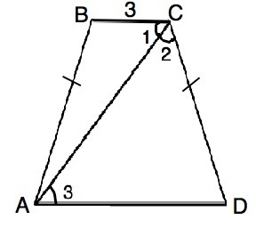 Пусть данная трапеция ABCD, AB=CD, АС - диагональ, делит угол ВСD на угол 1=угол2. Но АС - секущая при ВС||АD, поэтому угол 3=угол 1 (накрестлежащие), следовательно, углы 2 и 3 при основании АС треугольника АDC равны, и ∆ АDC- равнобедренный. AD=CD=AB=(P-BC):3. AD=(21-3):3=8 (ед. длины)
