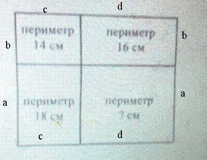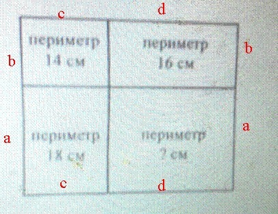 Прямоугольник разбили на четыре прямоугольника так, как показано на картинке. Периметры трех маленьких прямоугольников равны 14 см, 16 см и 18 см. Найдите периметры четвертого прямоугольника.