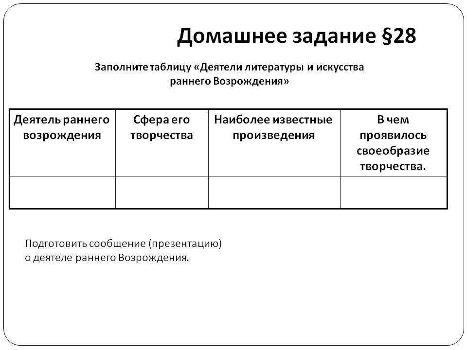 Заполните таблицу "Деятели литературы и искусства раннего Возрождения"