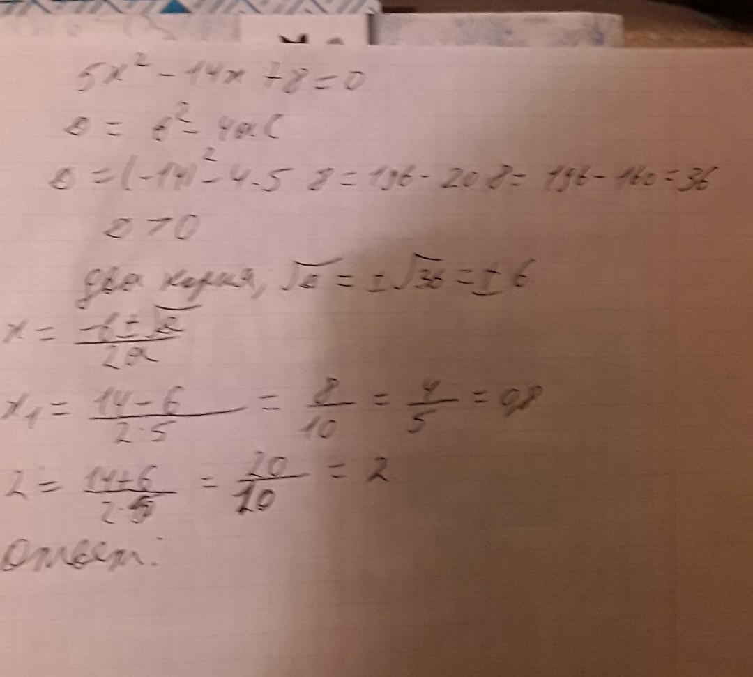Вот фото смотри решение уравнение! х1=0,8 и х=2