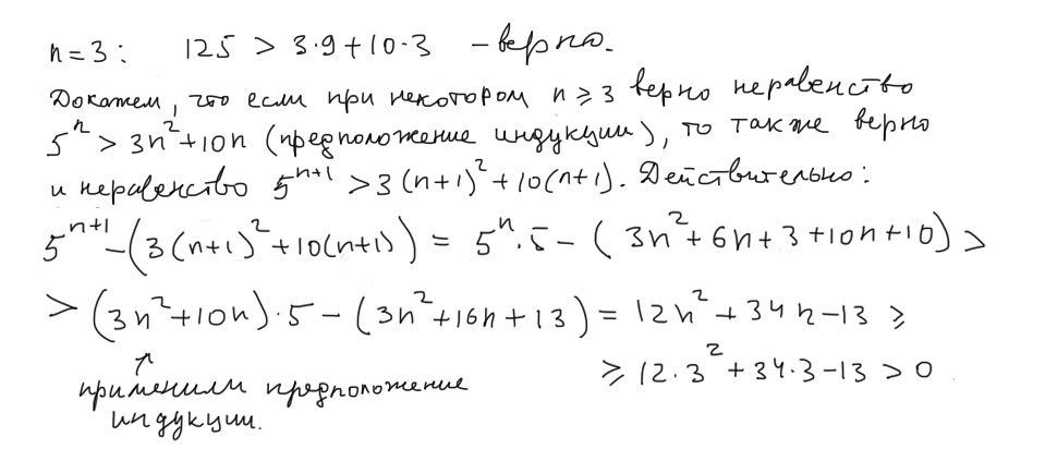 Методом математической индукции докажите, что при всех n ∈ ℕ, n ≥ 3 выполняется неравенство 5ⁿ > 3n² + 10n.