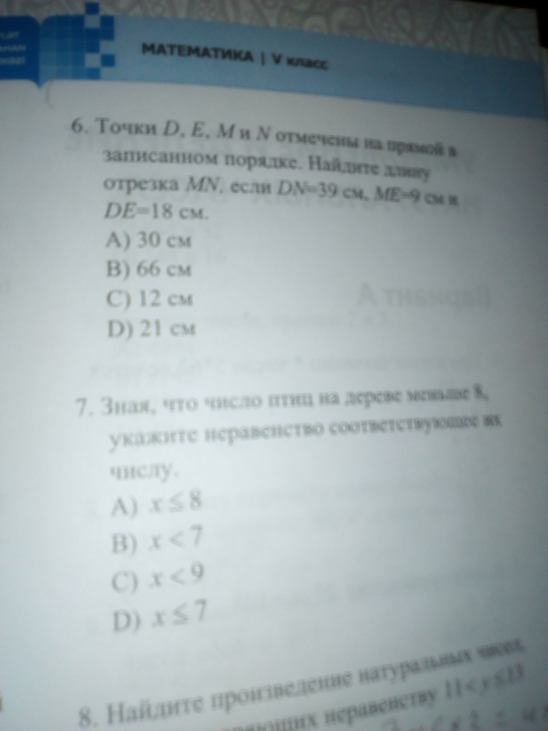 Ребят Помогите вот у меня задание точки D и M и N отмечены на прямой в заданном порядке Найдите длину отрезка M, N если M D равно 39 см а, м е равно 9 см и B равно 18 см ещё пожалуйста решите 6 и 7 пожалуйста я вам дам 11 баллов