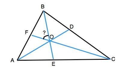 В треугольнике ABC, угол B=68 градусов, угол A=59 градусов. AD, BE, и CF - биссектрисы, пересекающиеся в точке O. Найдите угол BOF.