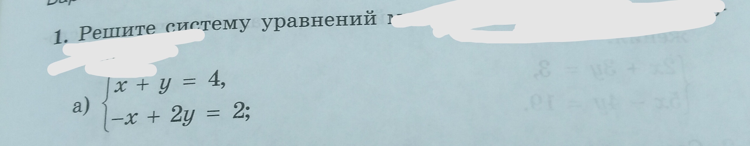 x=4-y. подставляем во 2 уравнение: -(4-y)+2y=2; y-4+2y=2; y+2y=4+2; 3y=6; y=6/3=2. x=4-2=2. Ответ: (2:2).