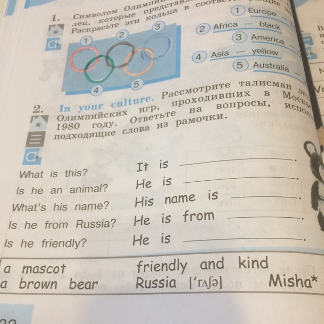 Рассмотрите талисман летних Олимпийских игр,проходившихся в Москве в 1980 году .Ответьте на вопросы ,используя подходящие слова из рамочки .