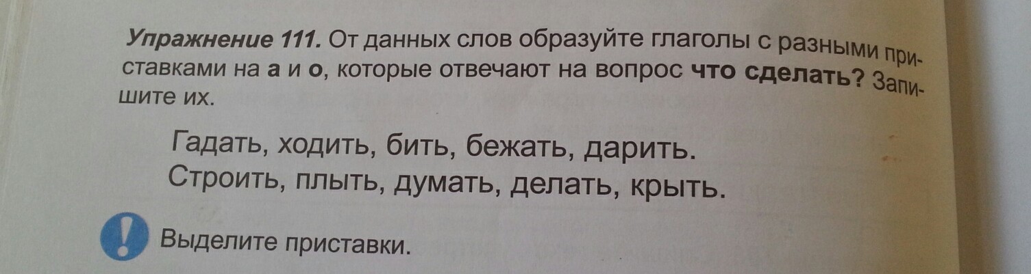 От данных слов образуйте глаголы с разными приставками на А и О,которые отвечают на вопрос ЧТО СДЕЛАТЬ?запишите их.Гадать,ходить,бить,бежать,дарить.Строить,поыть,думать,делать,крыть.
