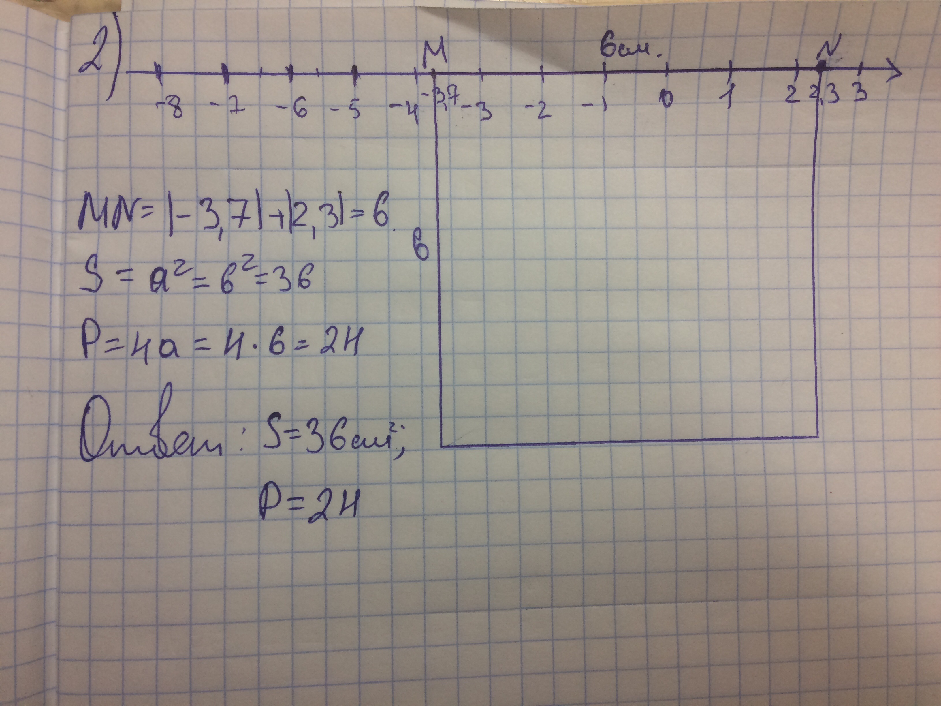 Найдите периметр и площадь квадрата со стороной М N, если М(-3,7) N(2,3). Единичный отрезок равен 1см.