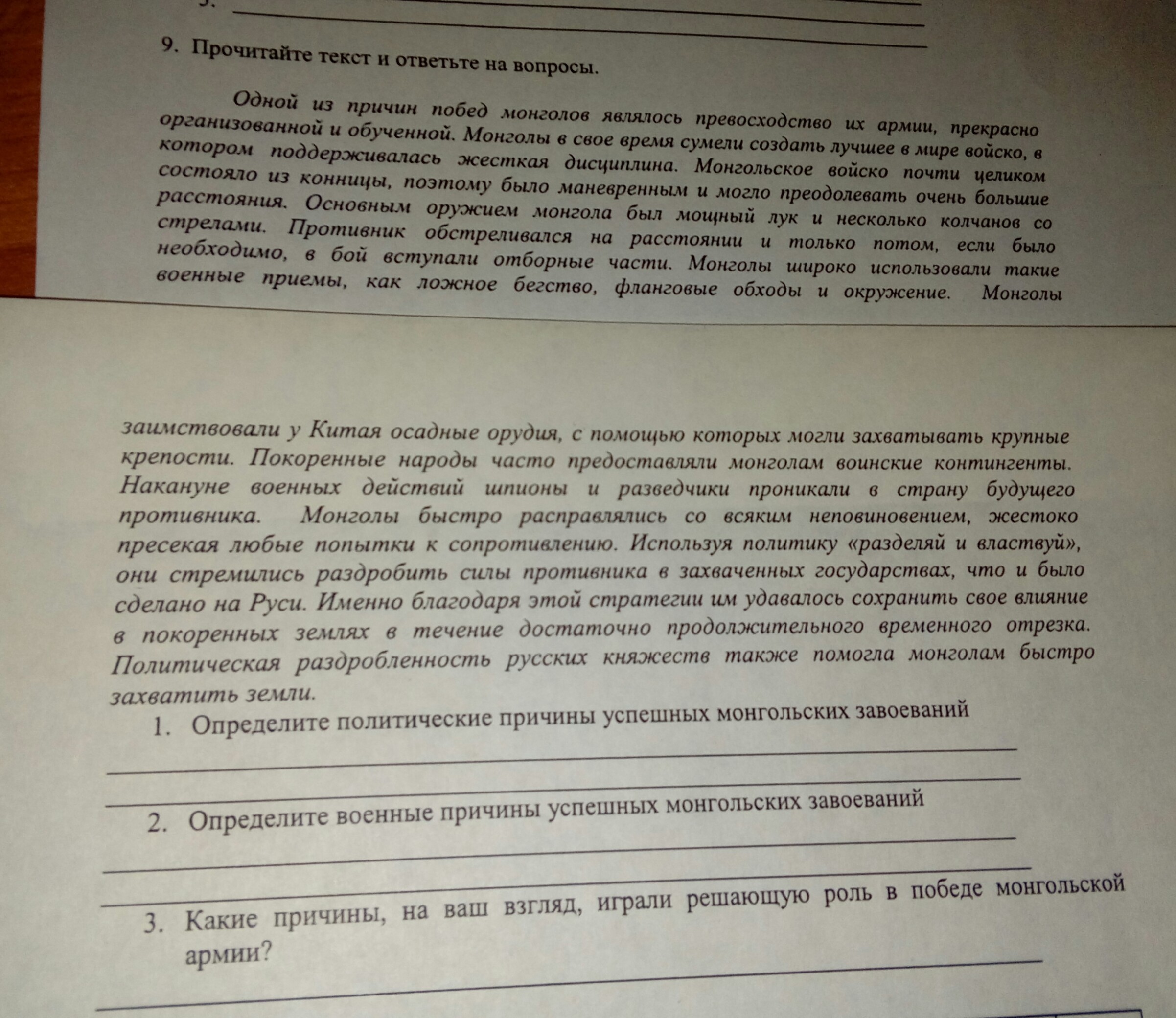 3) Решающую роль в победе монгольской армии, по моему мнению, сыграла численность и качество монгольской армии. Это были безжалостные люди, которые достигали побед любой ценой. Также важно было современное наступательное вооружение, которое позволяло достаточно быстро и эффективно осуществлять захват крупных крепостей и городов за считанные дни.