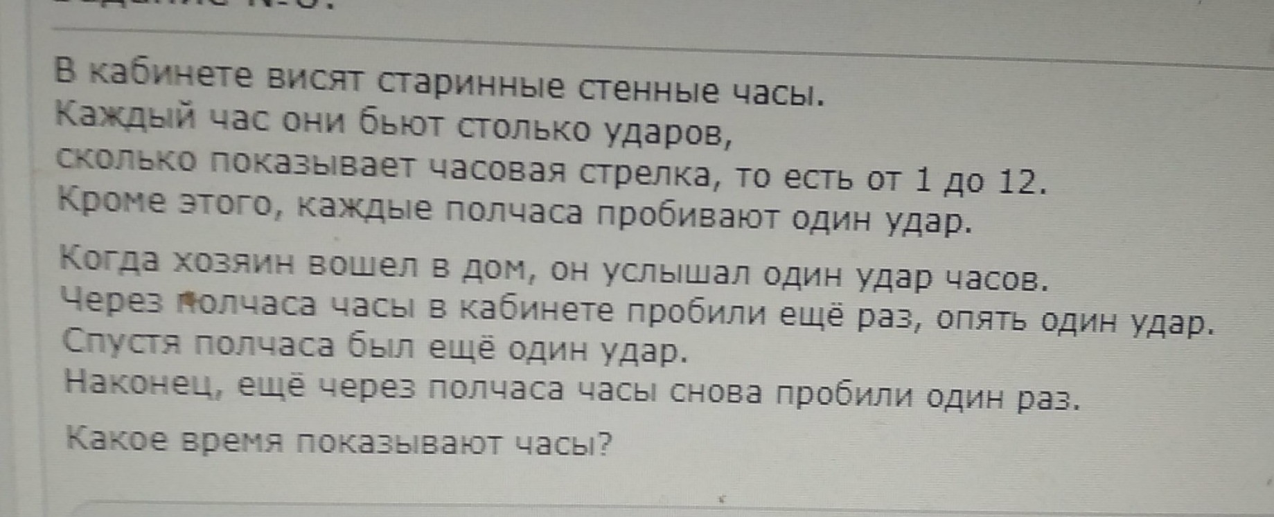 Два раза подряд по одному разу часы могут пробить либо в 12:30, а потом в 13:00(1:00PM), либо в 13:00(1:00PM), а потом в 13:30(1:30PM). А они пробили по одному разу три раза подряд. Значит это было в 12:30, потом в 13:00(1:00PM), а потом в 13:30(1:30PM). Значит сейчас 13:30(1:30PM)