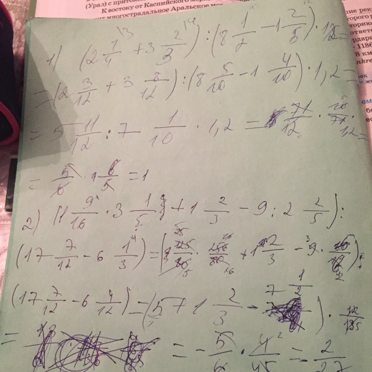 Вычислите значение выражения 1)(2 1/4 +3 2/3) : (8 1/2 - 1 2/5) *1,2 2)(1 9/16 * 3 1/5 + 1 2/3 - 9 :2 2/5):(17 7/12-6 1/3)