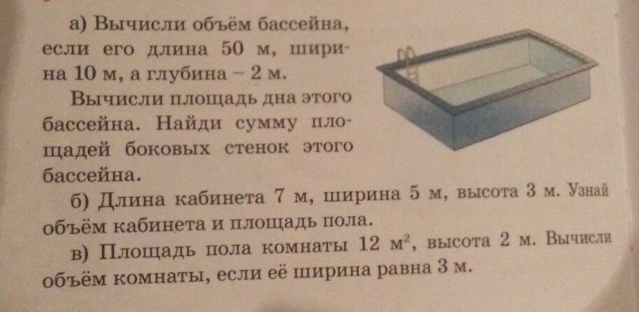 Что бы вычеслить объем бассейна нужно воспользоваться формулой: