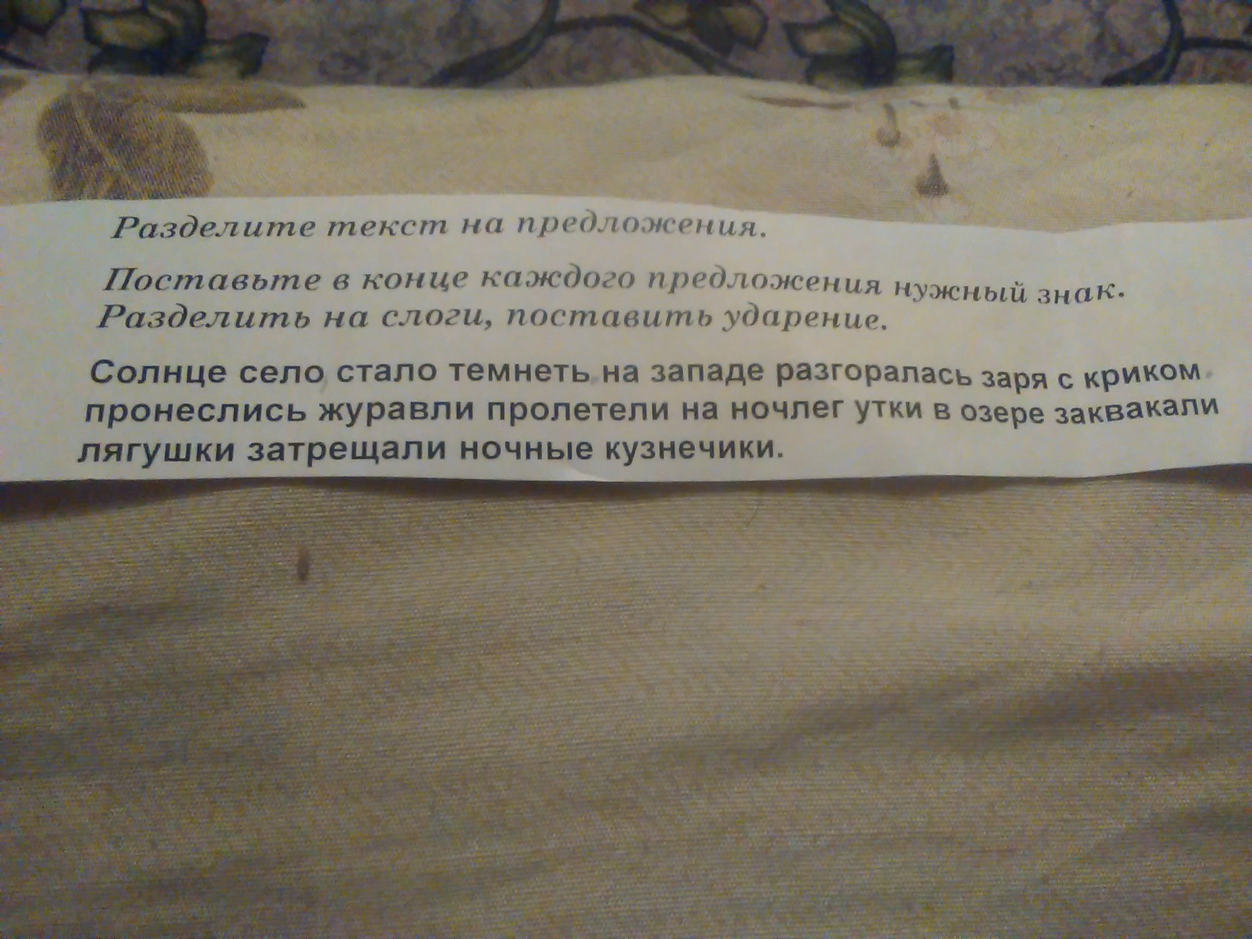 Солнце село,стало темнеть.На западе разгоралась заря.С криком пронеслись журавли.Пролетели на ночлег утки.В озере заквакали лягушки.Затрещали ночные кузнечики