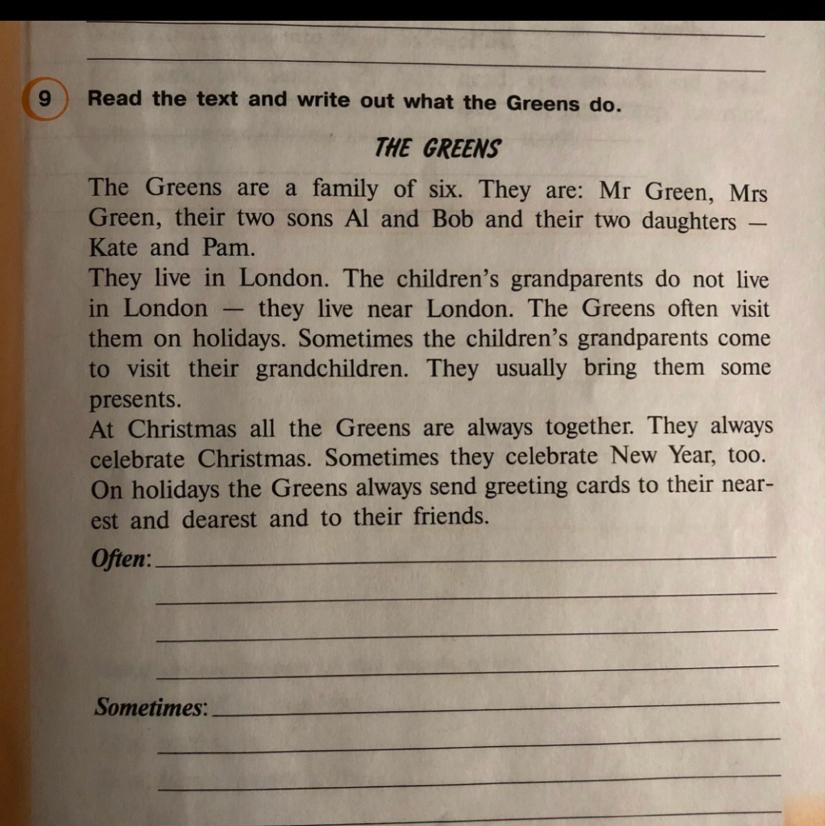 At Christmas all the Greens are always togethet and they always celebrate Christmas. The Greens always send greeting cards to their near-est and dearest and to their friends on holidays.