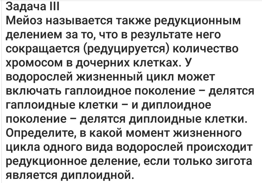 Первое мейотическое деление называют редукционным, так как именно во время этого деления происходит уменьшение числа хромосом, образуются две клетки с гаплоидным набором хромосом, однако хромосомы остаются двухроматидными. Сразу же после первого деления мейоза совершается второе – по типу обычного митоза. Это деление называют эквационным, так как во время этого деления хромосомы становятся однохроматидными.