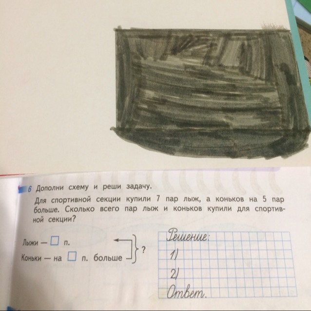 Дополни схему и реши задачу. Для спортивной секции купили 7 пар лыж, а коньков на 5 пар больше. Сколько всего пар лыж и коньков купили для спортивной секции ?