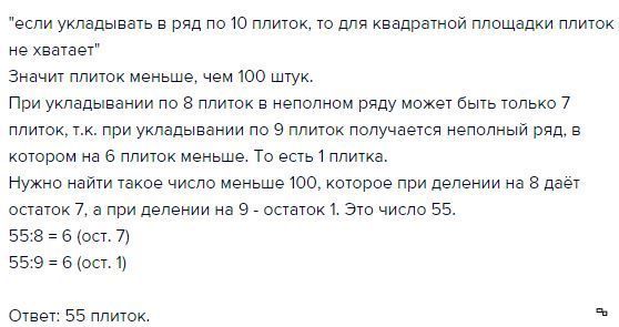 после строительства дома осталось некоторое количество плиток . их можно использовать для выкладывания прямоугольной площадки на участке рядом с домом... если укладывать в ряд по 10 плиток, то для квадратной площадки плиток не хватает. при укладывании в ряд по 8 плиток, остаётся один не полный ряд. а при укладывании по 9 тоже остаться не полный ряд в котором на 6 плиток меньше, чем в неполное ряду причин укладывании по 8. сколько всего плиток осталось после строительства дома????