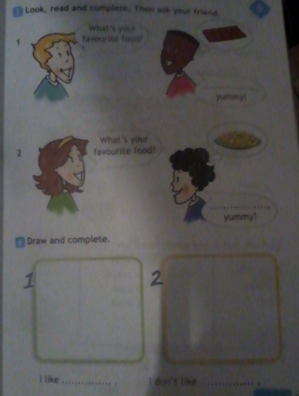 2. What's you favorite food?Ответ: Какая у тебя любимая еда? Говорит: yummy!Вкусный! Нужно написать там сверху показана картинки что любит, например: Chocolate (это картинка) и нужно написать. надеюсь понятно...
