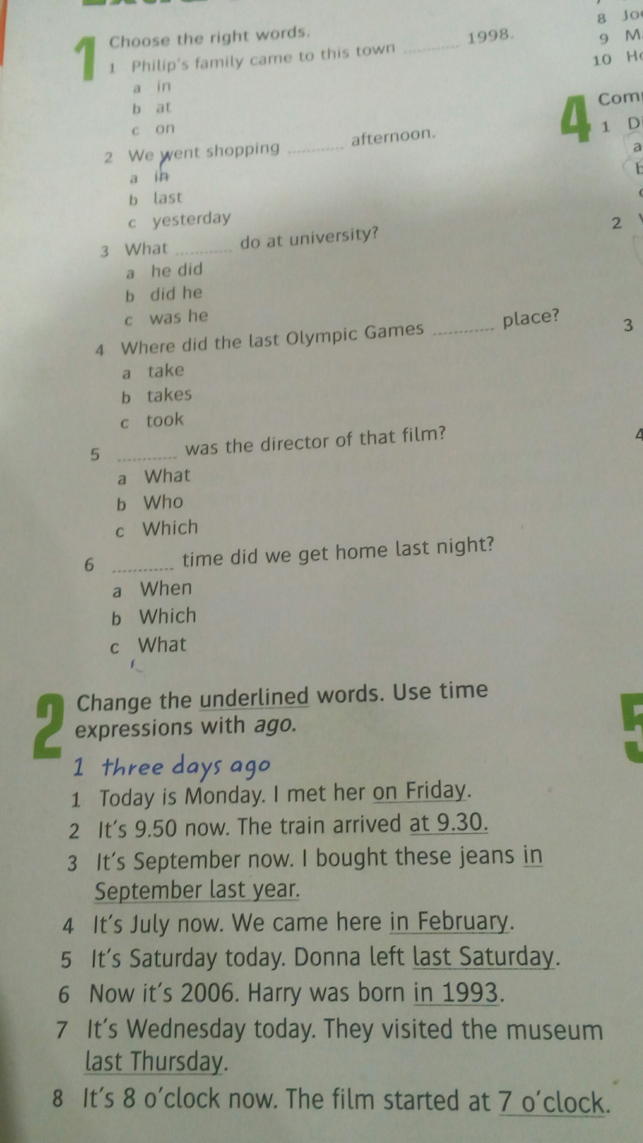 1. 1). Philip`s family came to this town in 1998. 2). We went shopping yesterday afternoon. 3). What did he do at university? 4). Where did the last Olympic Games take place? 5). Who was the director of that film? 6). What time did we get home last night?
