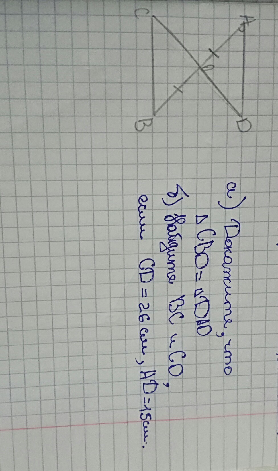 б)Найдите ВС и СО,если СД =26см,АД=15см