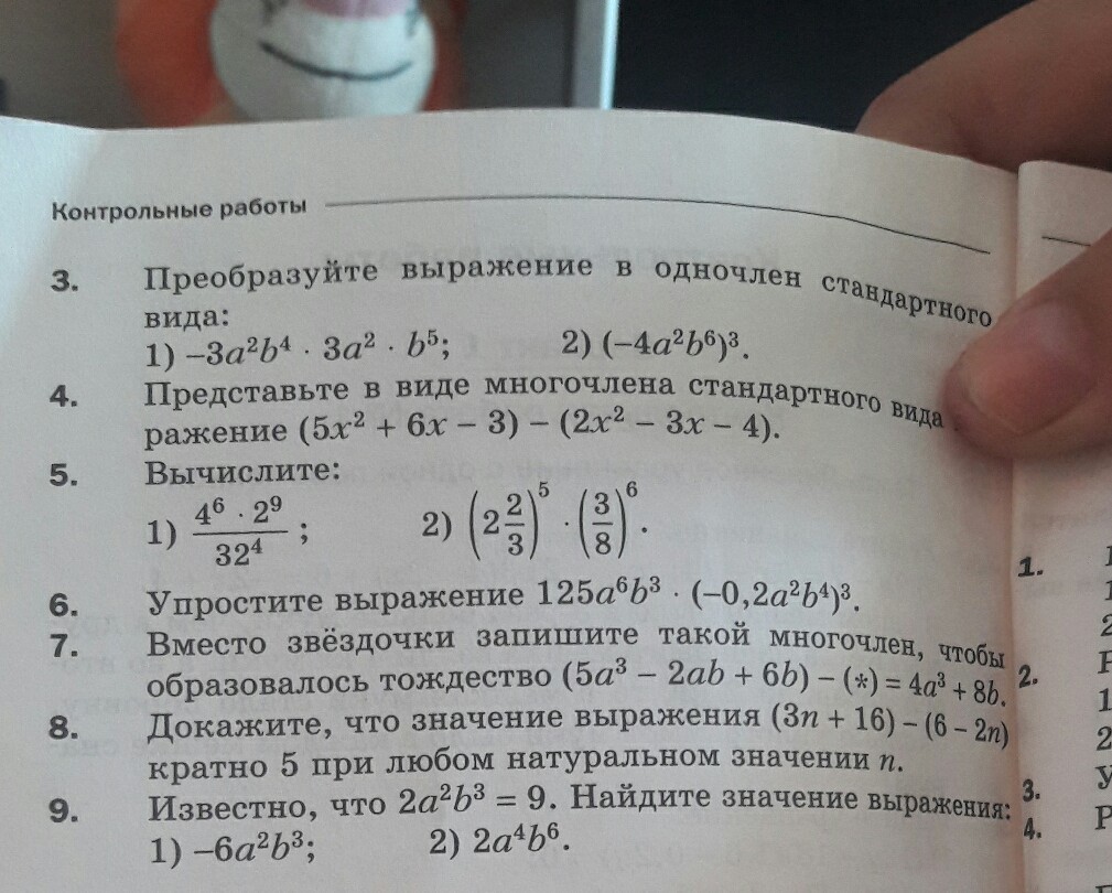 1). -3a^2b^4*3a^2*b^5= -9a^4b^9; 2).(-4a^2b^6)^3= -64a^6b^18. ^- это степень.