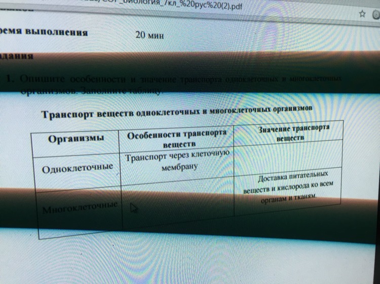 Опишите особенности и значение транспорта одноклеточныx и многоклеточныx организмов.Заполните таблицу