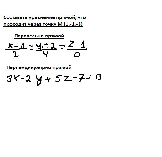 1a); ; M(1,-1,-3)in l_1; ,; ; l_1parallel; l_2\\l_2:; ;  frac{x-1}{2}=frac{y+2}{4}=frac{z-1}{0} ; ; to ; ; ; vec{s}_2=(2,4,0)=vec{s}_1\\l_1:; ; frac{x-1}{2}=frac{xy+1}{4}=frac{z+3}{0}\\1b); ; M(1,-1,-3)in l_3; ,; ; l_3perp pi \\pi :; ; 3x-2y+5z-7=0; ; -; ; ploskost; ; to ; ; vec{n}_{pi }=(3,-2,5)=vec{s}_3\\ l_3:; ; frac{x-1}{3}=frac{y+1}{-2}=frac{z+3}{5}