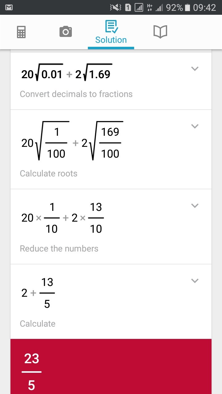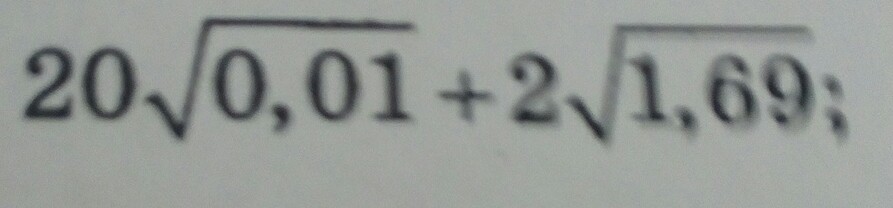 20√0,01 + 2√1,69 = √400 * √0,01 + 2 * 1,3 = √4 + 2,6 = 2 + 2,6 = 4,6
