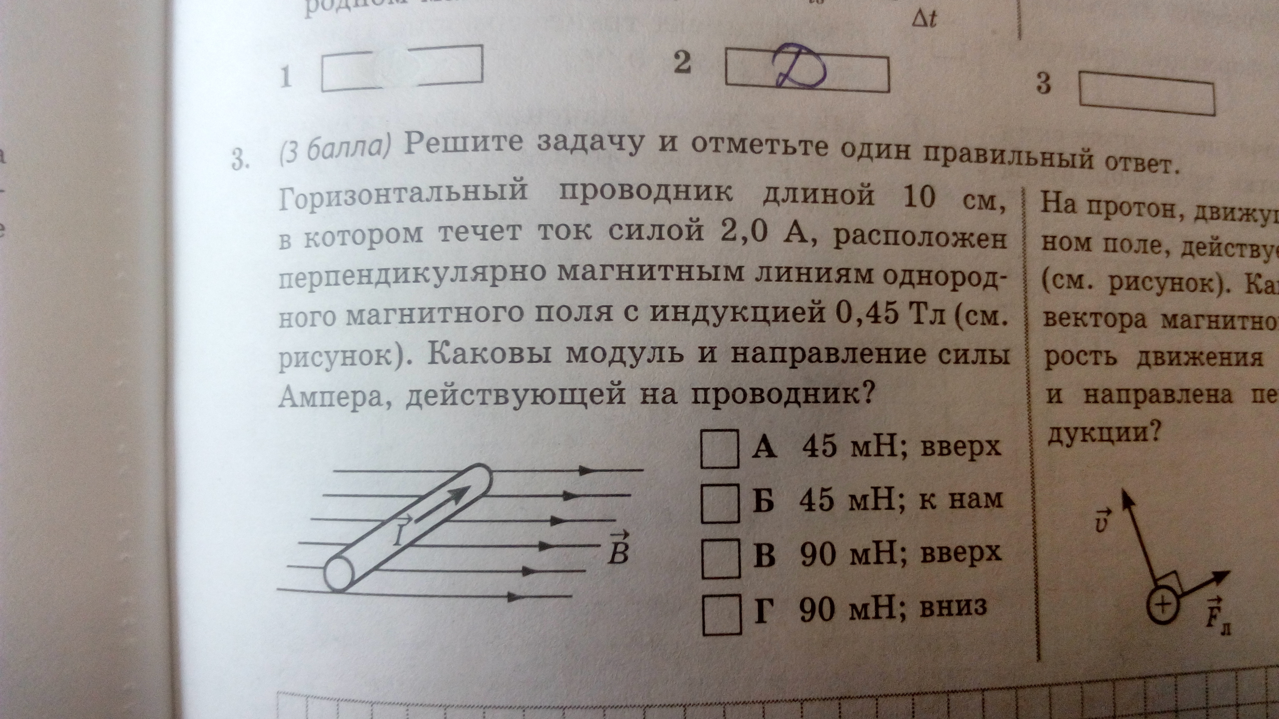F=I*B*L=2*0,45*0,1=0,09 H=90 мН вниз