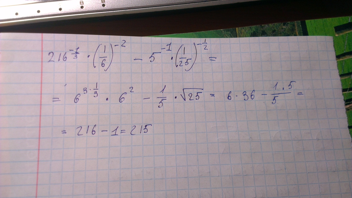 216 в степени минус одна третья умножить на (одну шестую) в степени минус 2 минус пять в степени минус 1 умножить на (одну двадцать пятую) в степени минус одна вторая или 216^-13*(16)^-2-5^-1*(125)^-12