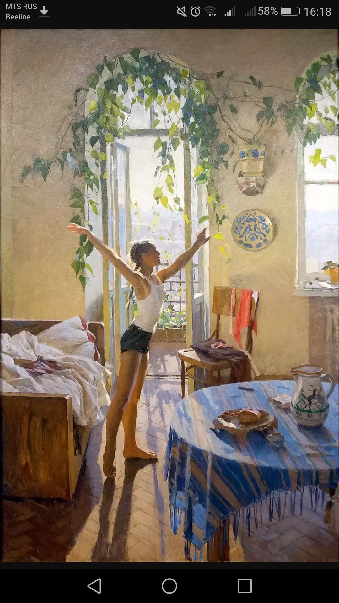 Художница делилась с нами простыми человеческими радостями: ясным утром, теплом, майской зеленью и свежестью. Доброй силой и молодостью наполнена ее картина. Энергия дня, вливаясь через высокие окна и двери, охватывает фигуру девочки и стремится к зрителю, вовлекая в бесконечный поток жизни, созидания, красоты.