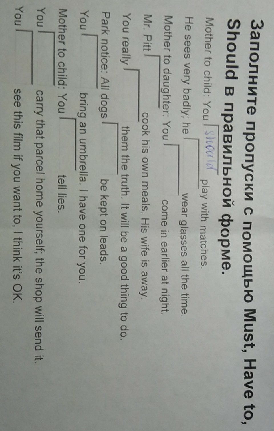 Заполните пропуски с помощью Must, Have to, Should в правильной форме.